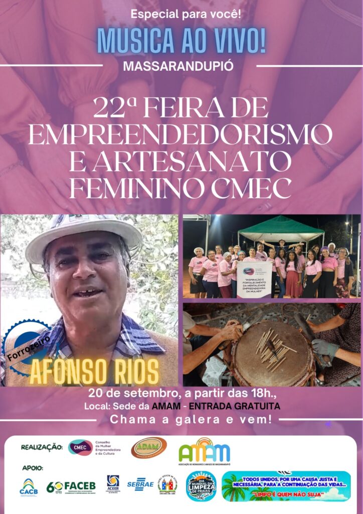No próximo dia 20 de setembro de 2025, Massarandupió será palco de um evento que une tradição, criatividade e celebração da força feminina. A 22ª Feira de Empreendedorismo e Artesanato Feminino do CMEC, em parceria com a AMAM, promete encantar moradores e visitantes com uma programação especial.